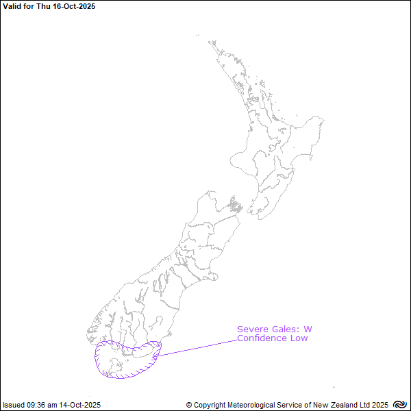 There is a low confidence that westerly winds will reach severe gale about coastal parts of Southland and Clutha, also Stewart Island for a time in the morning.