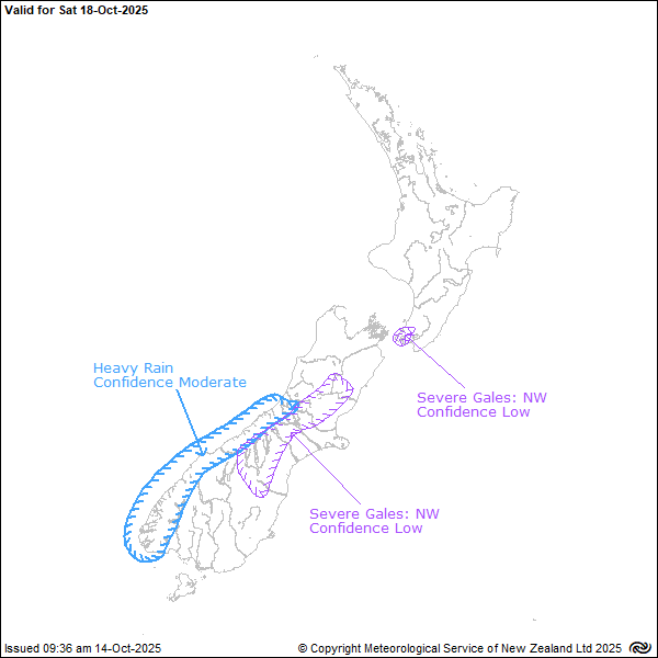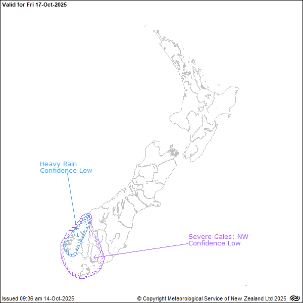There is moderate confidence that warning amounts of rain will accumulate in Fiordland and Westland, and low confidence that severe northwest gales will affect the Canterbury high country and Wellington.