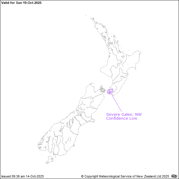 There is low confidence that severe northwesterly gales will affect Wellington.