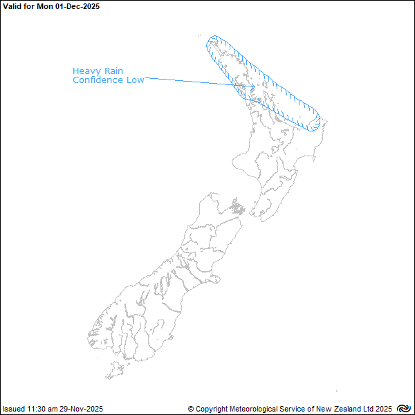 A trough should move eastwards across the upper half of the North Island, bringing rain in the early morning along with low confidence of warning amounts to Northland, northern and eastern Auckland, the Coromandel Peninsula and the eastern Bay of Plenty.