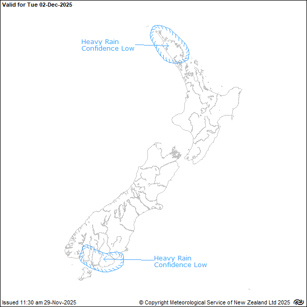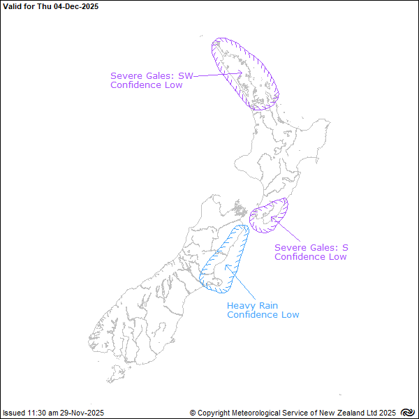 The trough and embedded low gradually move to the east of the country. There continues low confidence for significant heavy rain in Canterbury north of Rakaia and eastern Marlborough, and low confidence for severe southwest gales in parts of Northland, Auckland and Coromandel Peninsula. There is also low confidence for severe southerly gales in Wellington and Wairarapa.