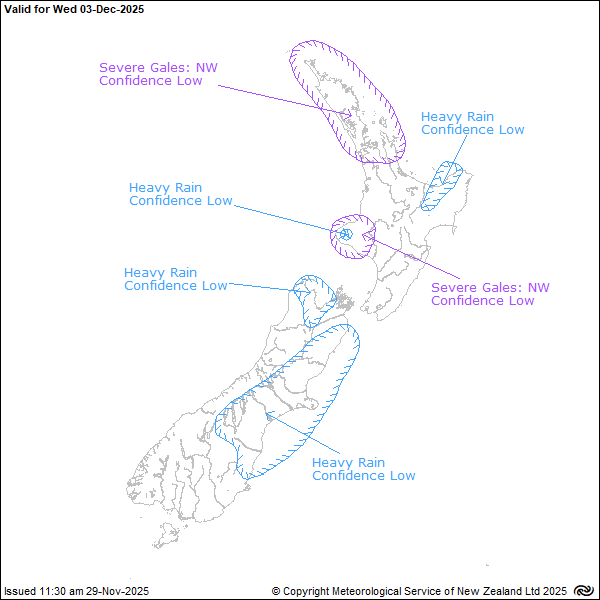 Additionally, there is low confidence northwest winds associated with the low could reach severe gale strength in exposed places of Northland, Auckland, Coromandel Peninsula, and Taranaki. Note, in the north of the North Island, the strong winds are expected to turn westerly late in the day with continuing low confidence for severe gales.