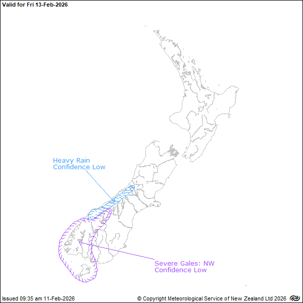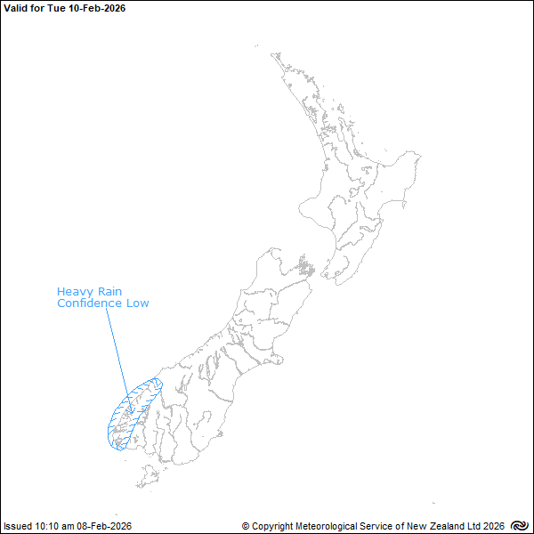 Meanwhile, a trough embedded in a strong northwesterly flow is expected to bring rain to Fiordland, and there is low confidence accumulations will reach warning criteria there.