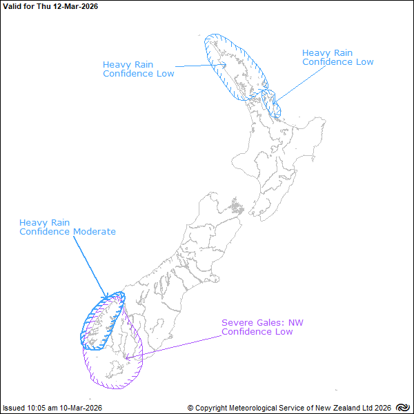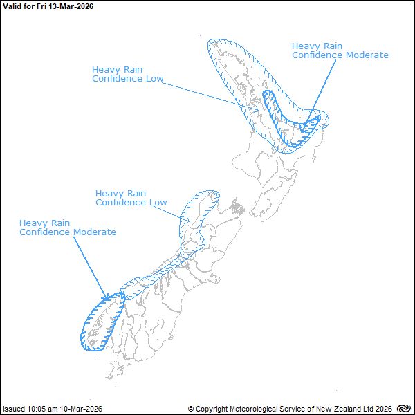 There is low confidence that warning amounts of rain will accumulate from Northland through to Taupo, also northern Gisborne/Tairawhiti, and from northwest Tasman to Westland, but moderate confidence that warning amounts of rain will accumulate in Coromandel Peninsula, Bay of Plenty and Fiordland.