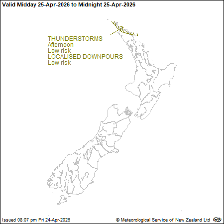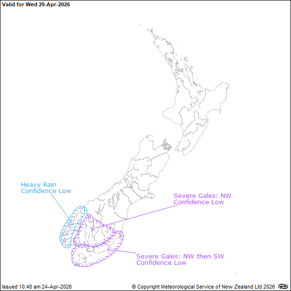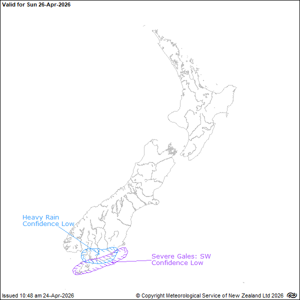 There is low confidence rain accumulations may approach the lower warning thresholds in Southland and Clutha. Additionally there is low confidence west to southwest winds may reach severe gale in exposed coastal places of Southland, Stewart Island and Clutha during the first part of the day.
