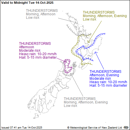 A front embedded in a northwest flow moves northeastwards over the North Island this afternoon. It is later followed by a second front, which brings a southwest wind change. Over the North Island, there is mostly a low risk of thunderstorms, as depicted on the chart. For Gisborne/Tairawhiti, Hawke's Bay, Manawatu, inland Whanganui, eastern Taranaki, Taihape, Taumarunui, southern Taupo, and the ranges of eastern Bay of Plenty, the risk is moderate this afternoon and evening. Any thunderstorms that occur will likely be accompanied by heavy rain with intensities of 10 to 20 mm/h. Hail 5 to 15 mm in diameter is also possible. Over the South Island, daytime heating and wind convergence is expected to cause showers to develop about Marlborough and Nelson/Tasman, and there is mostly a low risk of thunderstorms from late morning until this evening. For Tasman and inland Nelson, the risk of thunderstorms is moderate this afternoon. Any thunderstorms that occur will likely be accompanied by heavy rain with intensities of 10 to 20 mm/h. Hail 5 to 15 mm in diameter is also possible. There is minimal risk of thunderstorms or significant convection elsewhere in New Zealand during this period.