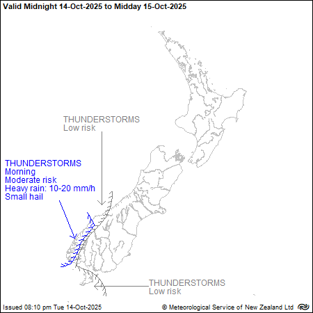 Chart reviewed at 8:10pm Tuesday and no changes made. A front preceded by a moist northwest flow moves over Fiordland during the morning. There is a moderate risk of thunderstorms for Fiordland after dawn, and a low risk from a few hours prior to dawn, which later in the morning extends southwards to include Stewart Island and northwards to include Haast. Any thunderstorms that occur will likely be accompanied by heavy rain with intensities of 10 to 20 mm/h, and possibly small hail. There is minimal risk of thunderstorms or significant convection elsewhere in New Zealand during Wednesday morning.