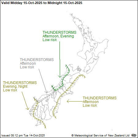 Chart reviewed at 8:10pm Tuesday and minor changes made. A front weakens as it moves up the West Coast during the latter half of Wednesday, while an unstable northwest flow persists over the deep south. There is a low risk of thunderstorms for most of Fiordland and Stewart Island in the evening and at night. There is also a low risk of thunderstorms for northern Fiordland and Westland south of the glaciers during the afternoon, and from the glaciers northwards to Buller during the afternoon and evening. Meanwhile, daytime sea breezes are expected to cause isolated showers to develop near the east coast from Dunedin to Marlborough, and there is a low risk of thunderstorms during the afternoon, as depicted on the chart. There is minimal risk of thunderstorms or significant convection elsewhere in New Zealand during this period.