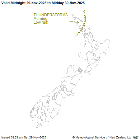 A warm front moves onto the northern North Island on Sunday morning. There is an associated low risk of one or two thunderstorms over Northland from late morning. There is minimal risk of any thunderstorms or severe convection over other parts of New Zealand on Sunday morning.