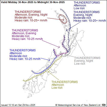 A front in the Tasman Sea moves quickly over the South Island during Sunday afternoon and onto the North Island in the evening. Over the North Island, there is a moderate risk of periods of thunderstorm activity about central and southern Northland through the whole period, about Taranaki and Horowhenua/Kapiti in the late afternoon and evening, and about other northern and western areas from northern Northland to Coromandel Peninsula and Manawatu in the evening or at night as indicated on the chart. A low risk of thunderstorms also affects the northern and western North Island in the afternoon, and Bay of Plenty, Rotorua, Taupo, Taihape and Wellington from evening. Any thunderstorms that occur will produce localised heavy rain of 10-25mm/h (or possibly more in one or two places). Over the South Island, there is a moderate risk of elevated thunderstorms embedded within broader areas of rain about southern Tasman, Buller, Grey, Westland and the Canterbury High Country near the main divide during the afternoon, and about other parts of Tasman/Nelson and northern/western Marlborough in the late afternoon and early evening. These thunderstorms will boost local rainfall rates into the 10-25mm/h range. A low risk covers areas further east and south into northern Fiordland as indicated on the chart. There is a minimal risk of thunderstorms or significant convection over other parts of New Zealand during this period.